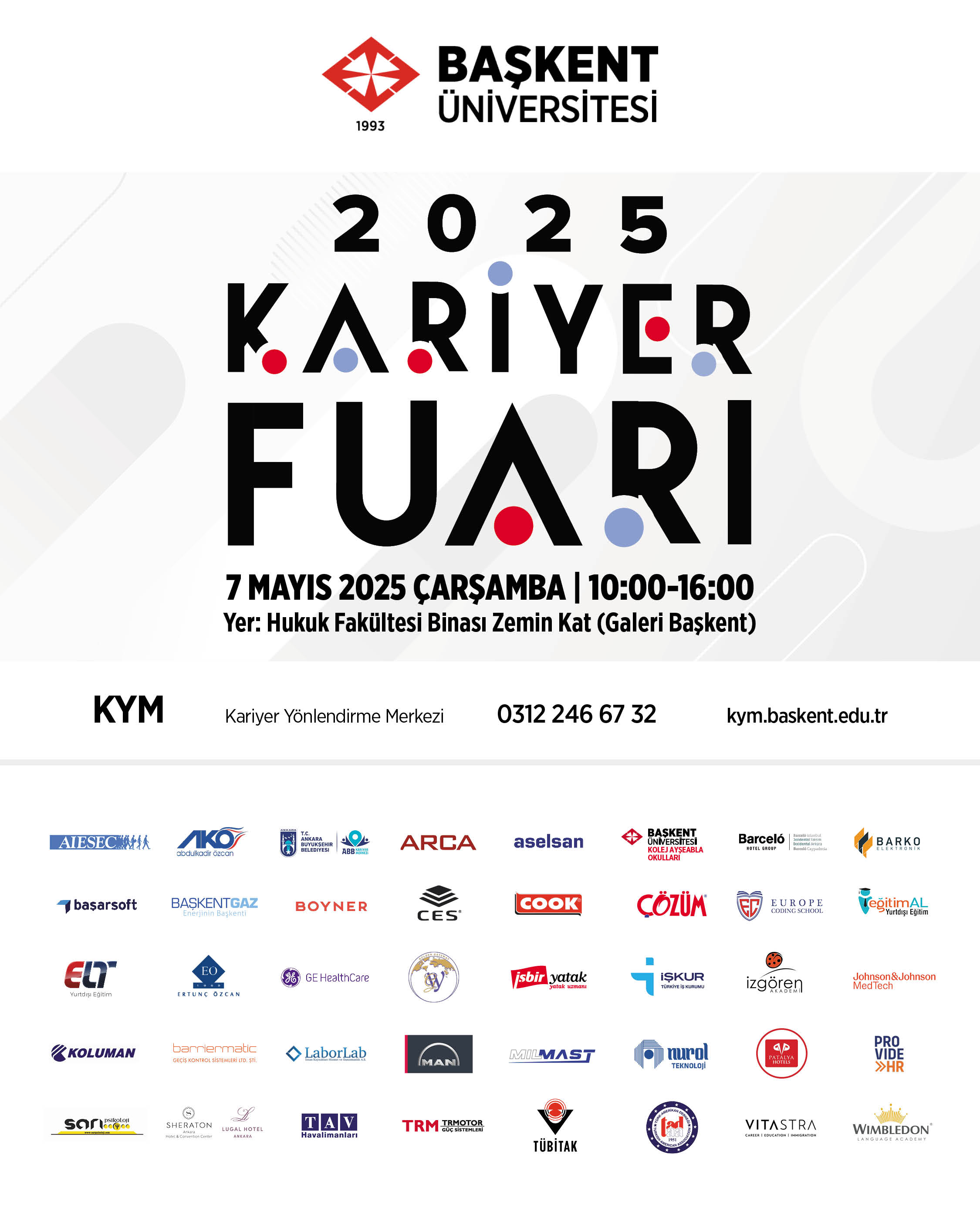 7 Mayıs 2025 Çarşamba günü 10:00-16:00 saatleri arasında Bağlıca Kampüsü Hukuk Fakültesi Binası Zemin Kat’ta 2025 Başkent Üniversitesi Kariyer Fuarı düzenlenecektir. Katılımcı firmaların listesine buradan ulaşabilirsiniz.